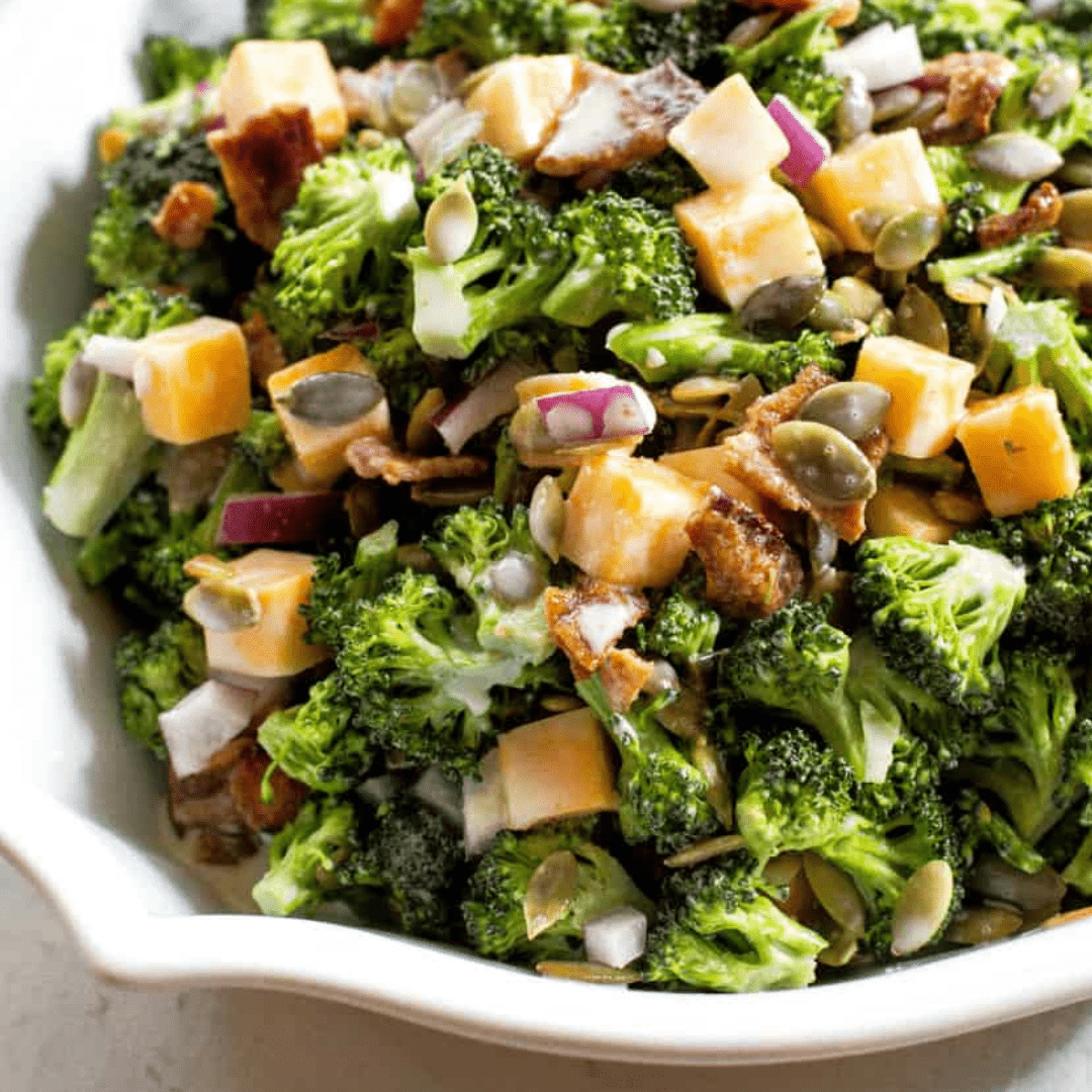 1. Combine broccoli, red onion, sunflower or pumpkin seeds, and cheese in a large bowl.