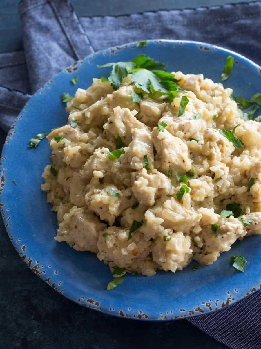 Add the cauliflower rice, chicken broth, and cream. Simmer for 10 minutes or until liquid reduces. Stir in the Parmesan cheese and serve.